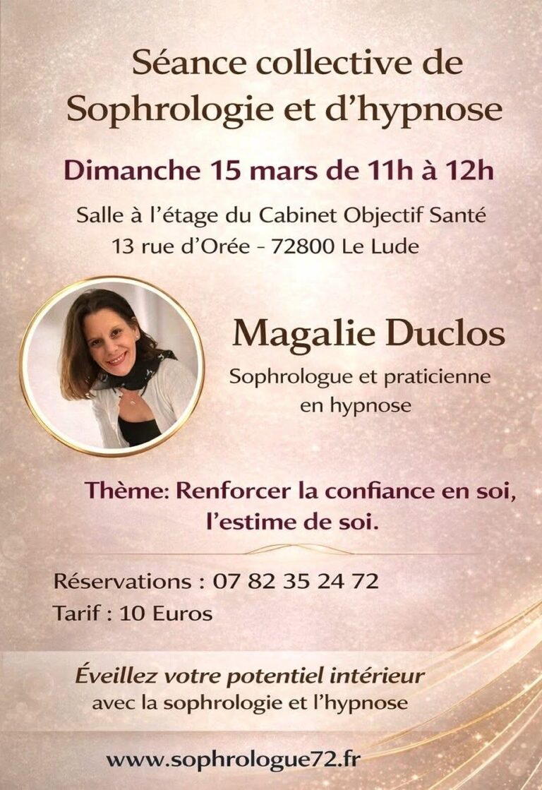 Stages-Ateliers-Formations Agenda des prochains évènements Pour vous inscrire, contacter l'animateur / l'animatrice de chaque évènement Programme des séances Do-IN1 séance collective par mois - Novembre 2025 à juillet 2026 - Par Magali Sionneau En savoir plus... Sophro-Hypnose du 15 mars 2026Renforcer la confiance et soi et l'estime de soi - de 11h00 à 12h00 - Par Magalie Duclos